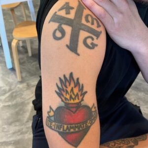 “รอยสักแรกของผมมีความหมายมากที่สุด” เขากล่าว โดยชี้ไปที่ไม้กางเขนขนาดใหญ่บนไหล่ขวาของเขา โดยมีตัวอักษร AMDG อยู่รอบๆ “คำขวัญของคณะเยสุอิตคือ ‘Ad Majorem Dei Gloriam’ ซึ่งในภาษาลาตินแปลว่า ‘เพื่อพระสิริอันยิ่งใหญ่ของพระเจ้า’”